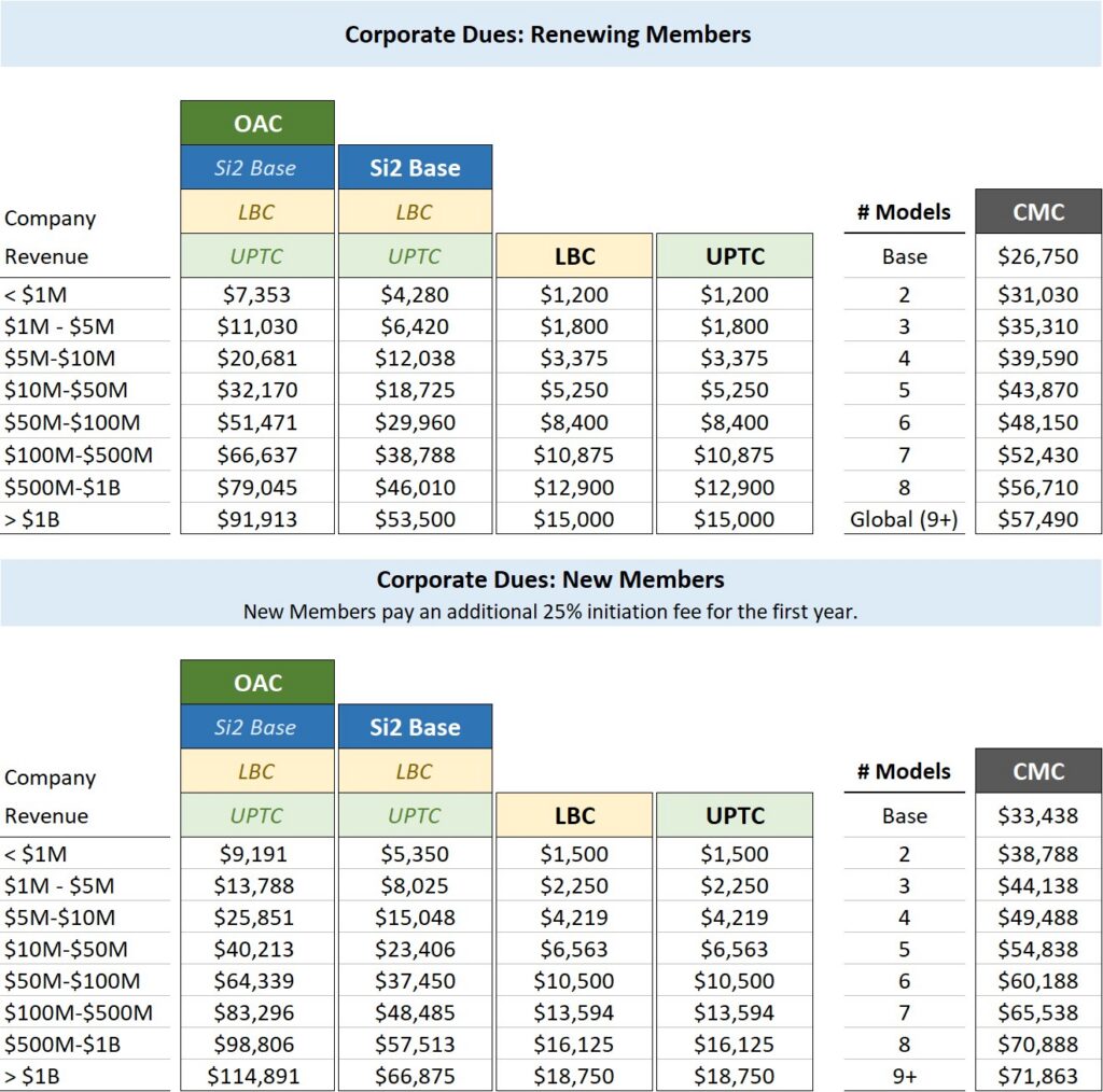 For all memberships, there is an initiation fee added to the first year of membership for new members. To get an estimate of the dues for your company please select the appropriate membership combination and use the tables below to determine the total cost. Dues for the Compact Model Coalition (CMC) depend on the number of standard models designated, dues for the other memberships are based on the total corporate revenue. Dues do not change with the number of users within the member company.